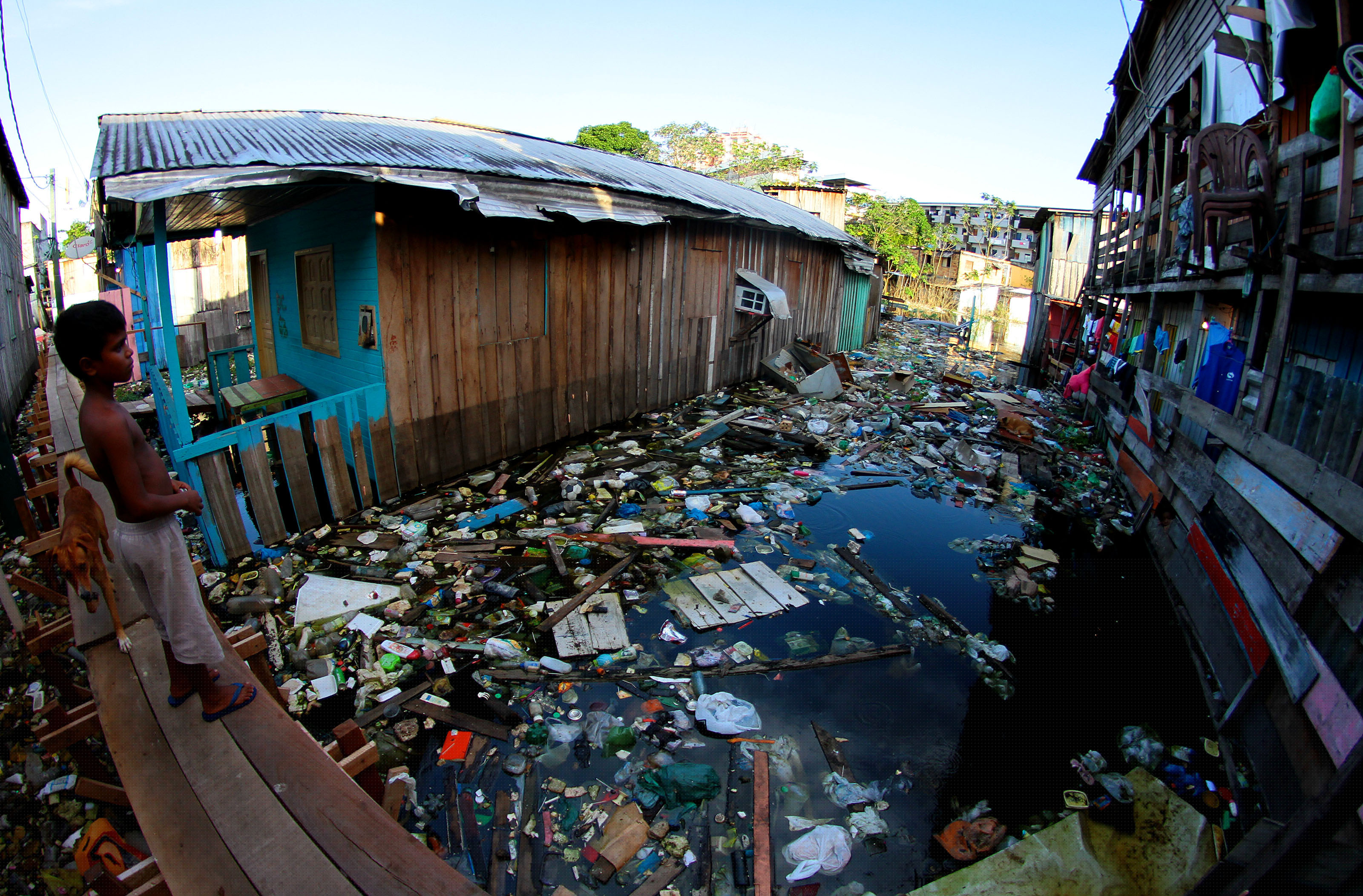 Mulher na janela e criança na passarela de madeira em meio a grande quantidade de lixo em igarapé de Manaus.
