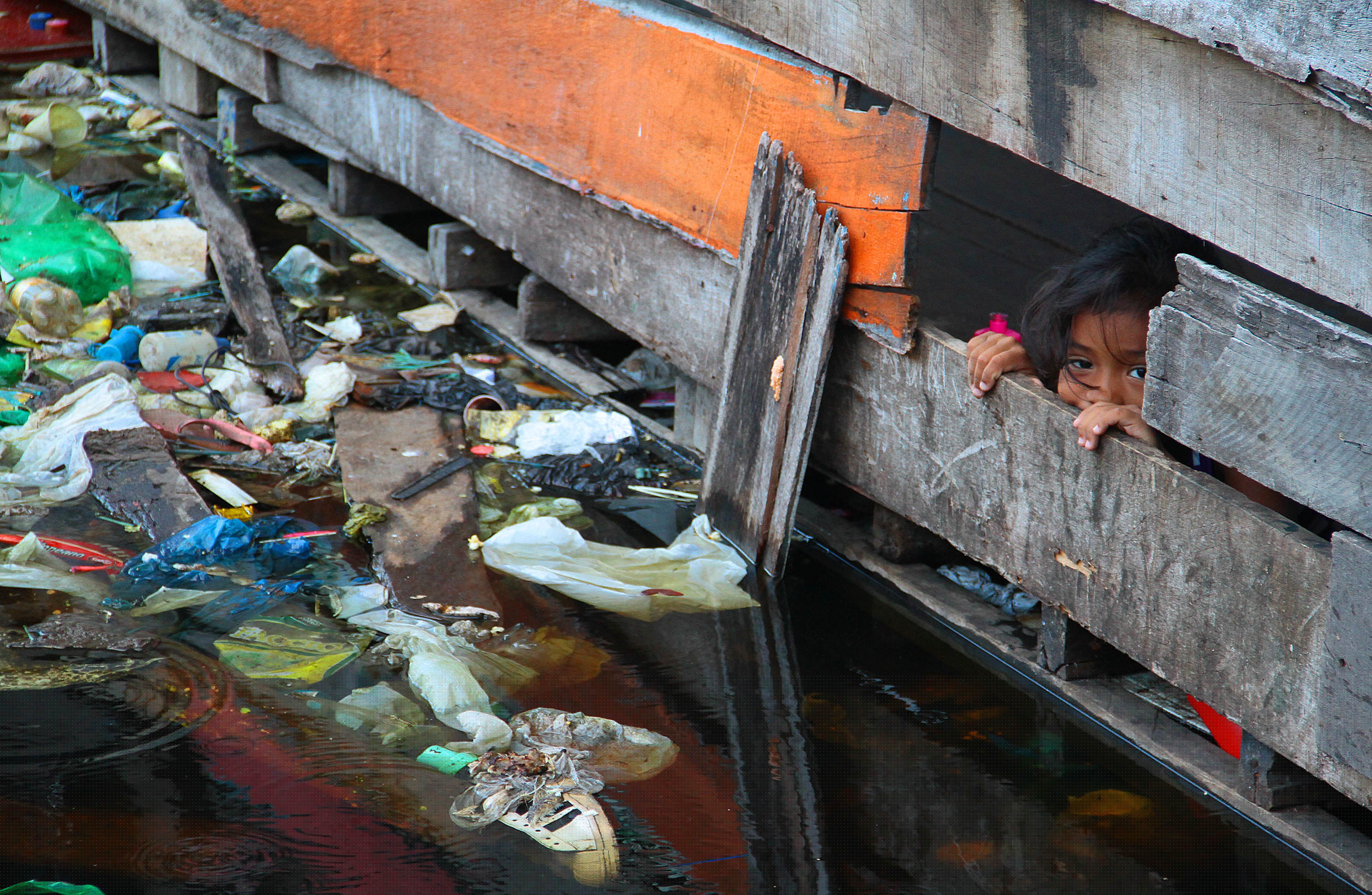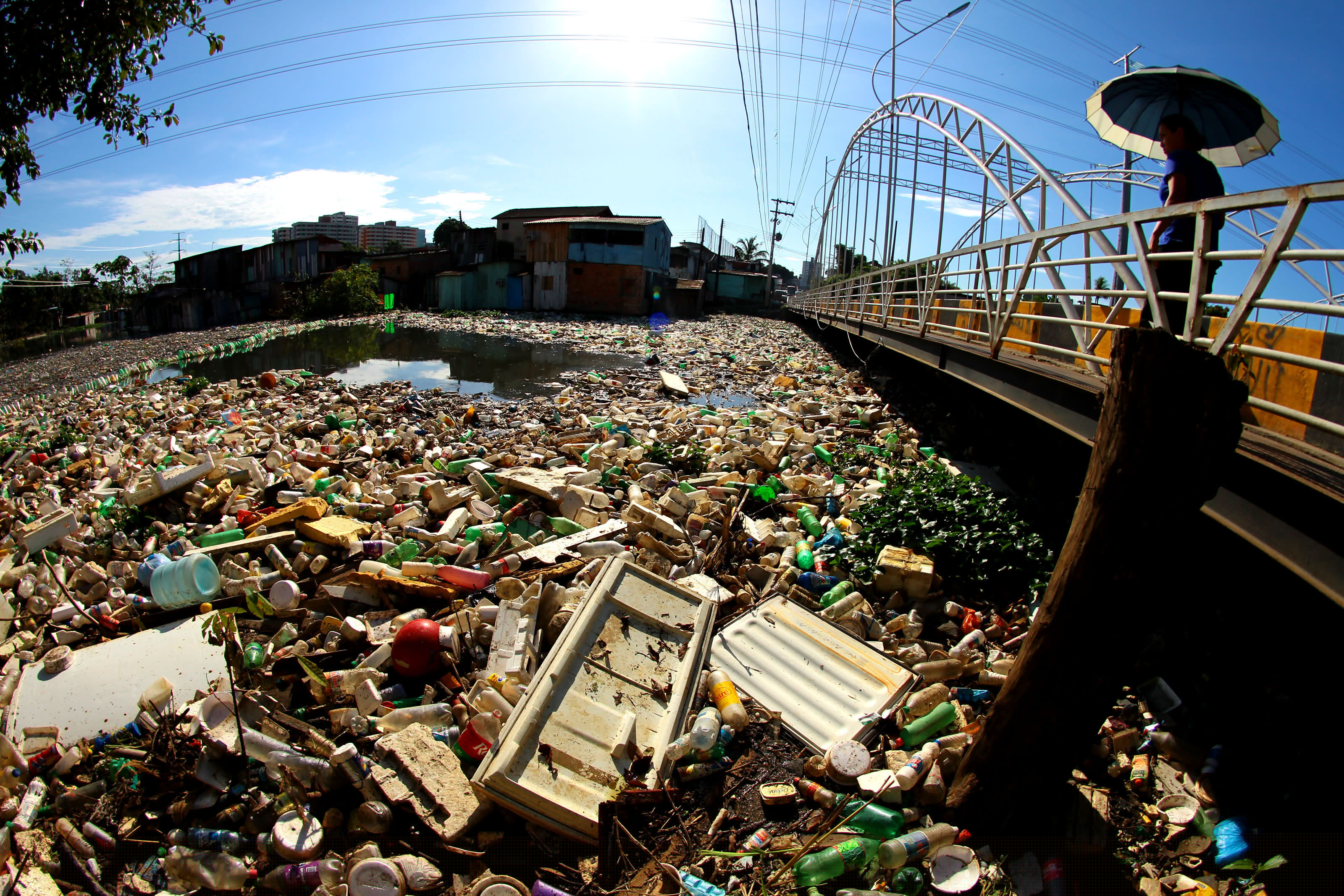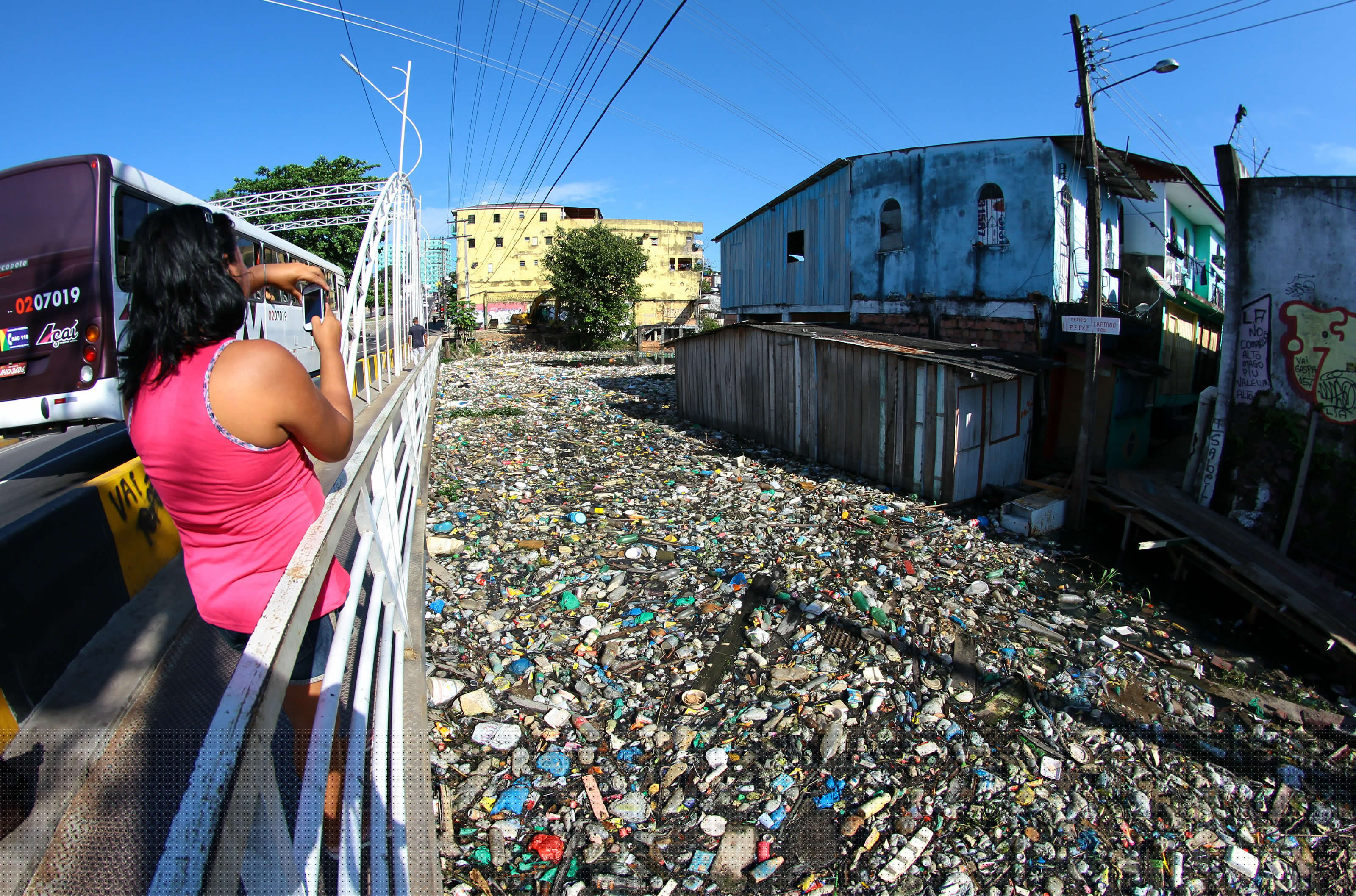 - Criança observa grande quantidade de lixo acumulado no igarapé da ponte do bairro São Jorge, em Manaus (AM). A época de cheia dos rios e a falta de estrutura para escoamento e drenagem de águas pluviais provocam o acúmulo de lixo e o alagamento de casas na região. Edmar Barros/Amazônia Latitude