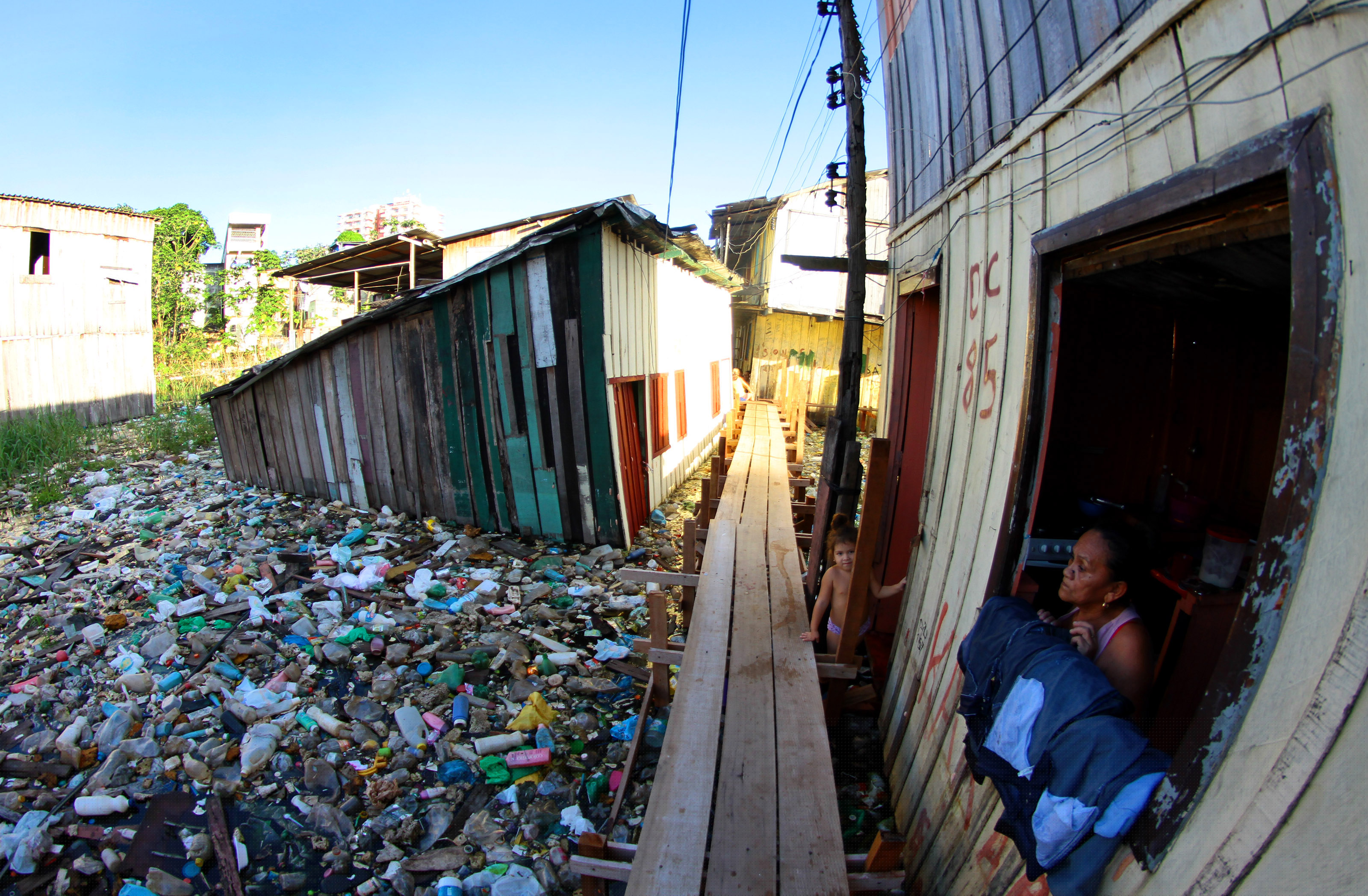 - Para atravessar a inundação de água e lixo, moradores construíram passarela no bairro São Raimundo, em Manaus-AM. A convivência com o entulho e a falta de acesso a saneamento básico provoca doenças que poderiam ser facilmente evitadas. Edmar Barros/Amazônia Latitude