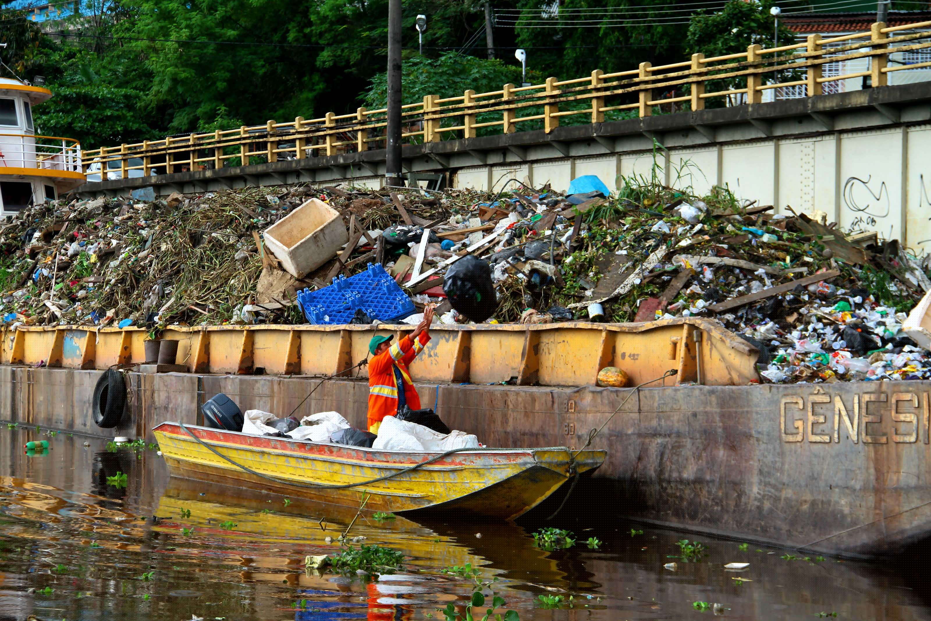 - Garis tentam recolher a grande quantidade de lixo acumulado no igarapé da ponte do bairro São Jorge, em Manaus, no dia 04 de julho de 2019. A cheia dos rios e a falta de estrutura apropriada para drenagem de água da chuva ocasiona o acúmulo de lixo. À época, a prefeitura afirmou ao recolher cerca de 30 toneladas de lixo por dia a um custo de R$ 1 milhão por mês. Edmar Barros/Amazônia Latitude