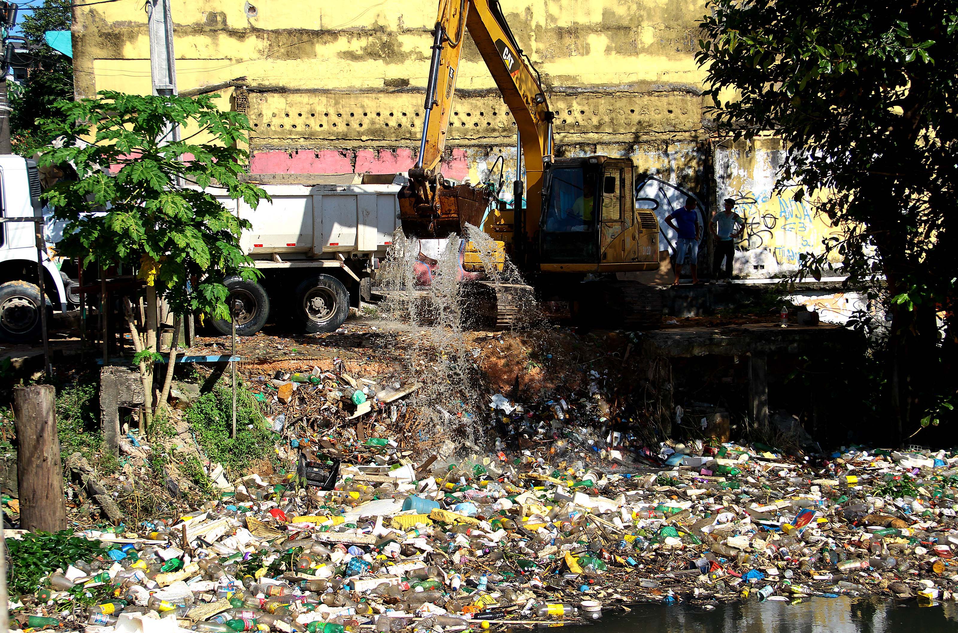 1 – Balsa com escavadeira recolhe lixo jogado no igarapé do bairro Educandos, no centro de Manaus(AM) em 03 de maio de 2019. O jornal A Crítica diz que a prefeitura do município gastou R$ 70 milhões para retirada de entulhos de 2013 a junho de 2019. Edmar Barros/Amazônia Latitude.