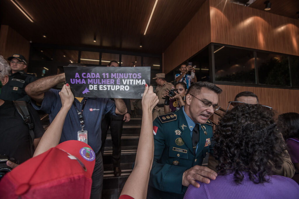Na chegada à Assembleia Legislativa, houve um conflito quando policiais militares lançaram spray de pimenta contra manifestantes. Pelo menos uma mulher foi socorrida pelas próprias manifestantes e levada à UPA-Jurunas.