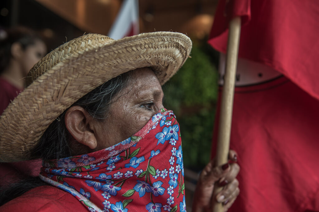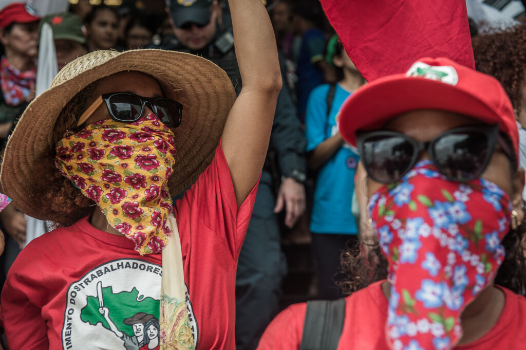 No caminho, integrantes do MST (Movimento dos Trabalhadores Rurais Sem Terra) realizaram uma intervenção com tinta vermelha, simulando sangue, na fachada da Faepa (Federação da Agricultura e Pecuária do Pará).