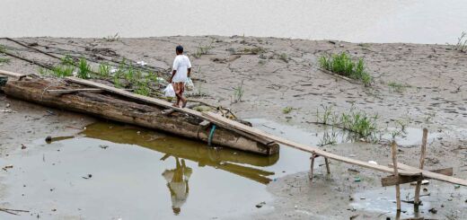 Homem caminha por onde era o leito do Rio Solimões. Foto: Antônio Caldas / Amazônia Latitude