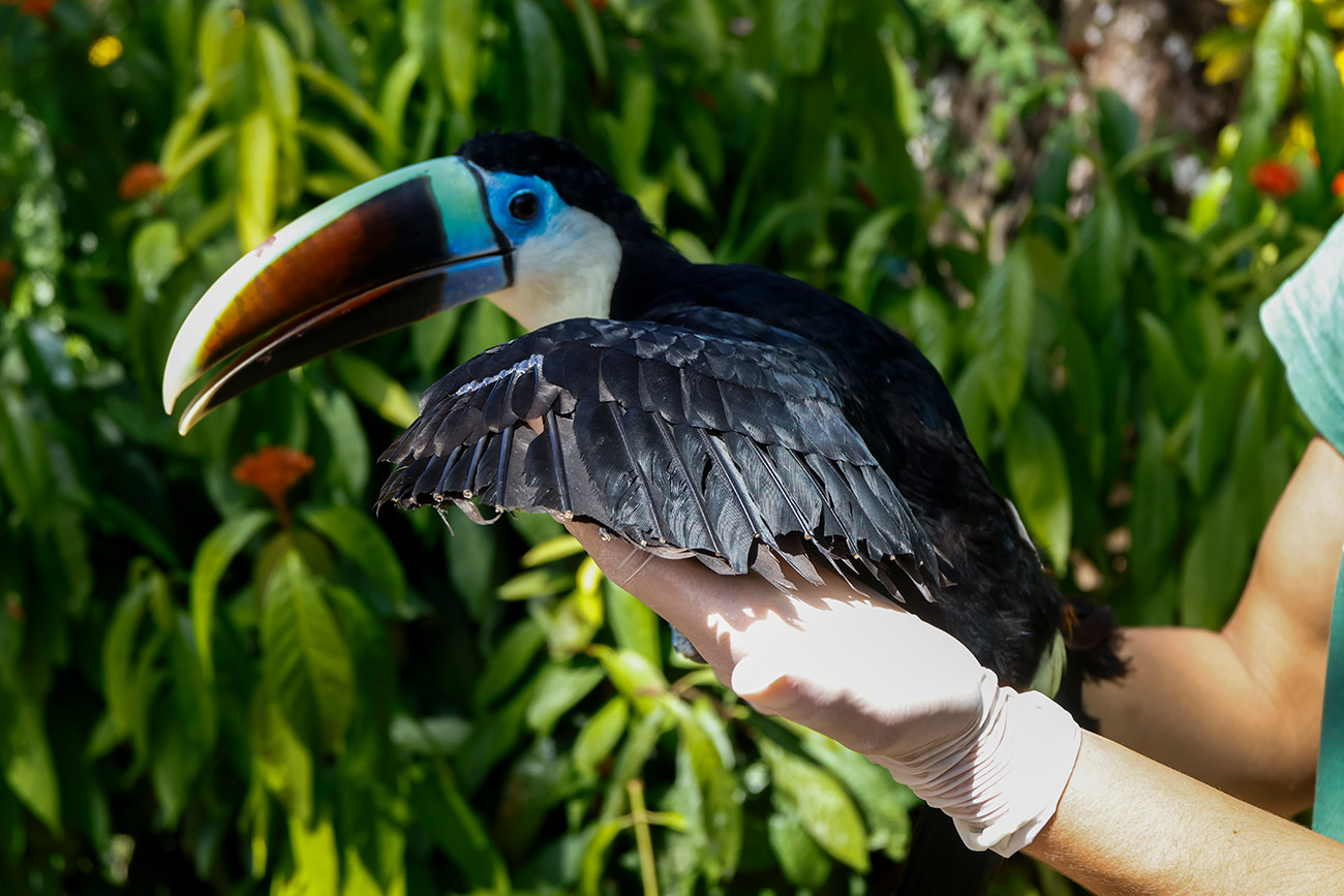 Enquanto fala, o papagaio aproveita para caminhar pelo seu braço e observar as aves vizinhas: um casal de tucanos de papo branco, Ycaro e Yara (Ramphastos tucanus), também com as asas cortadas e que ganharam peso desde que foram resgatados. Cada um deles mora em um viveiro, separados por uma grade, dentro de um dos blocos do Centro.