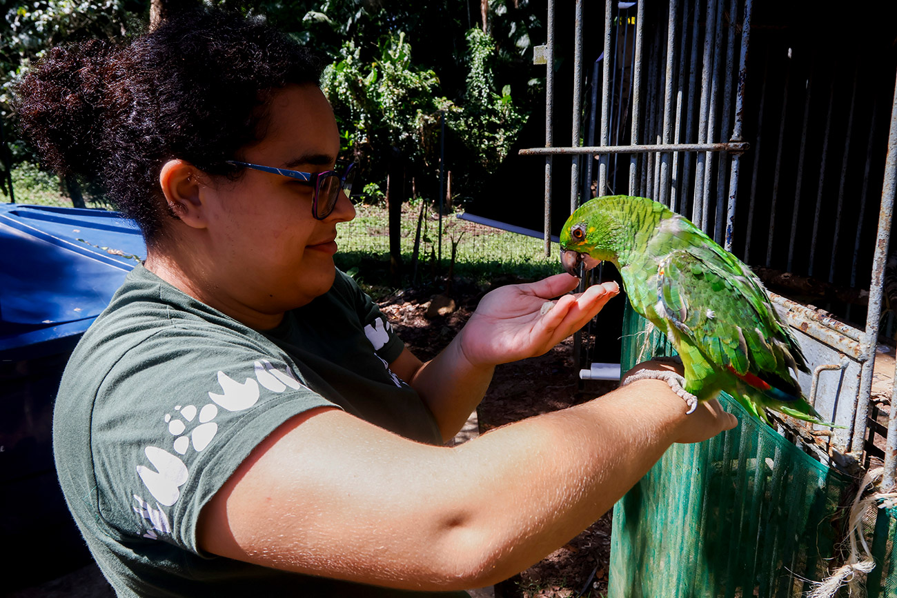 “É um grande privilégio trabalhar com esses animais. Aqui temos quem tenha sido resgatado ainda filhote. As aves se comunicam mais, algumas vocalizam, os papagaios falam bastante. Mas as outras espécies são mais silenciosas, pois a maioria delas evoluiu para não se mostrar vulnerável na natureza. Aprendemos sobre empatia, tentando compreender suas necessidades e captar os seus sinais mais silenciosos de desconforto”, comenta a veterinária.
