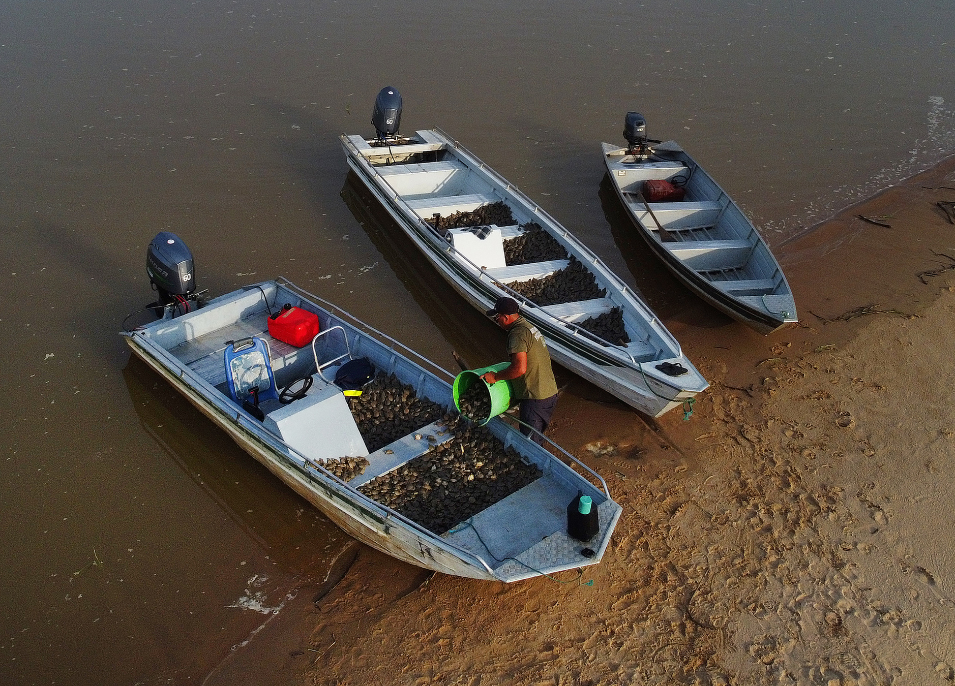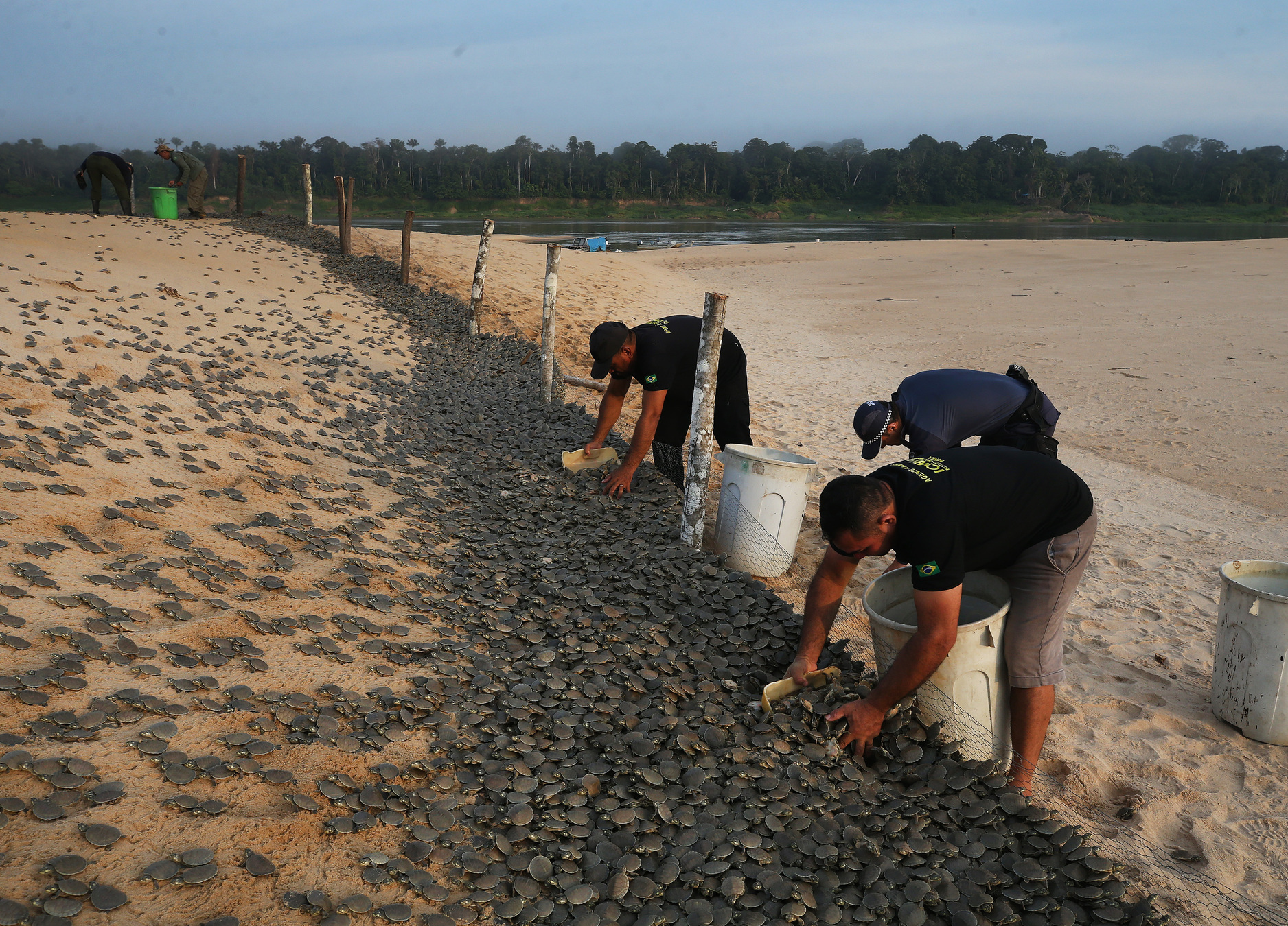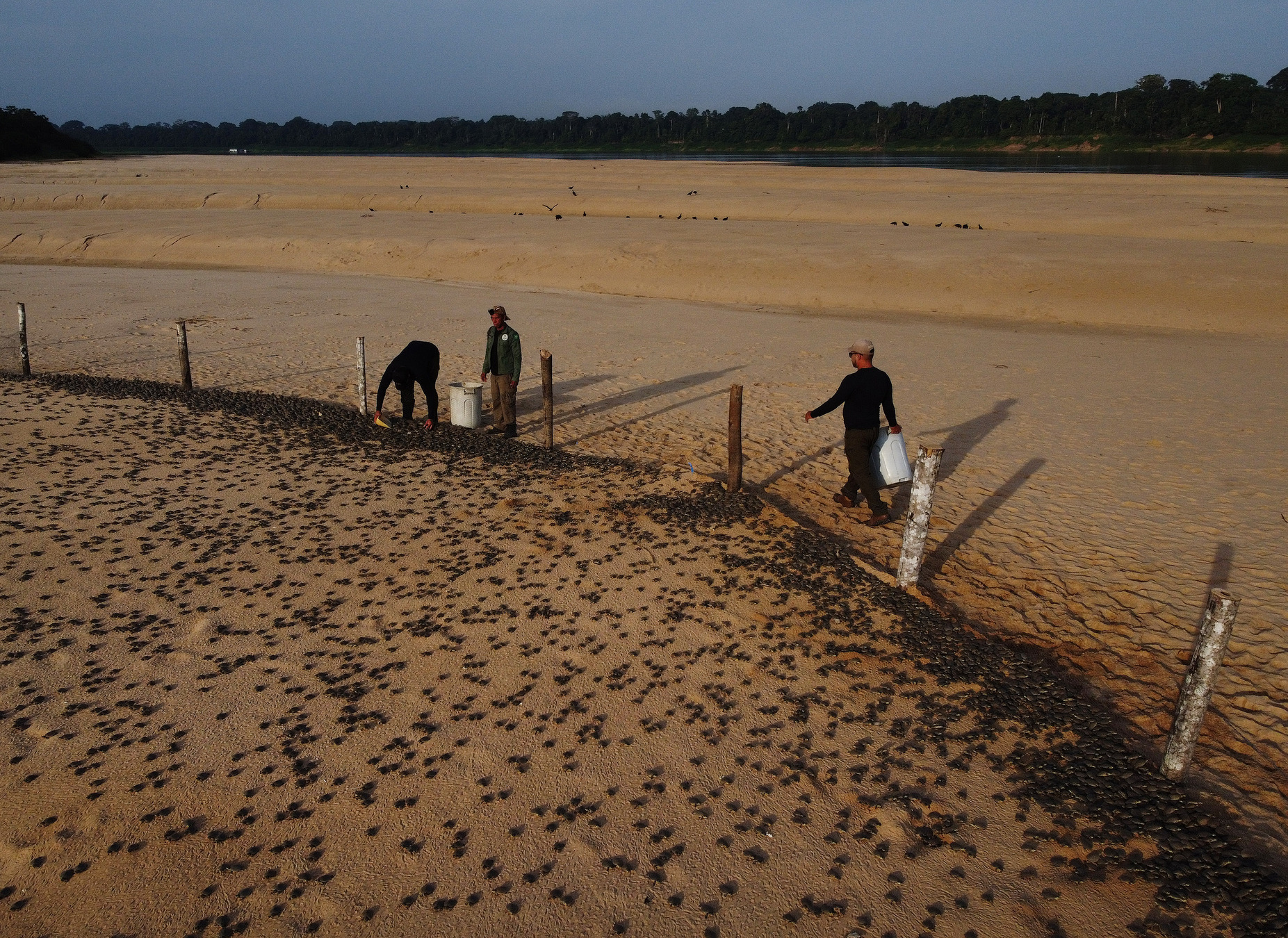 Agentes ambientais do ICMBio, recolhem filhotes de tartaruga-da-amazônia, para serem soltas em local mais seguro, na Reserva Biológica do Abufari, em Tapauá (AM), 17 de novembro de 2025. Foto: Edmar Barros/Amazônia Latitude.