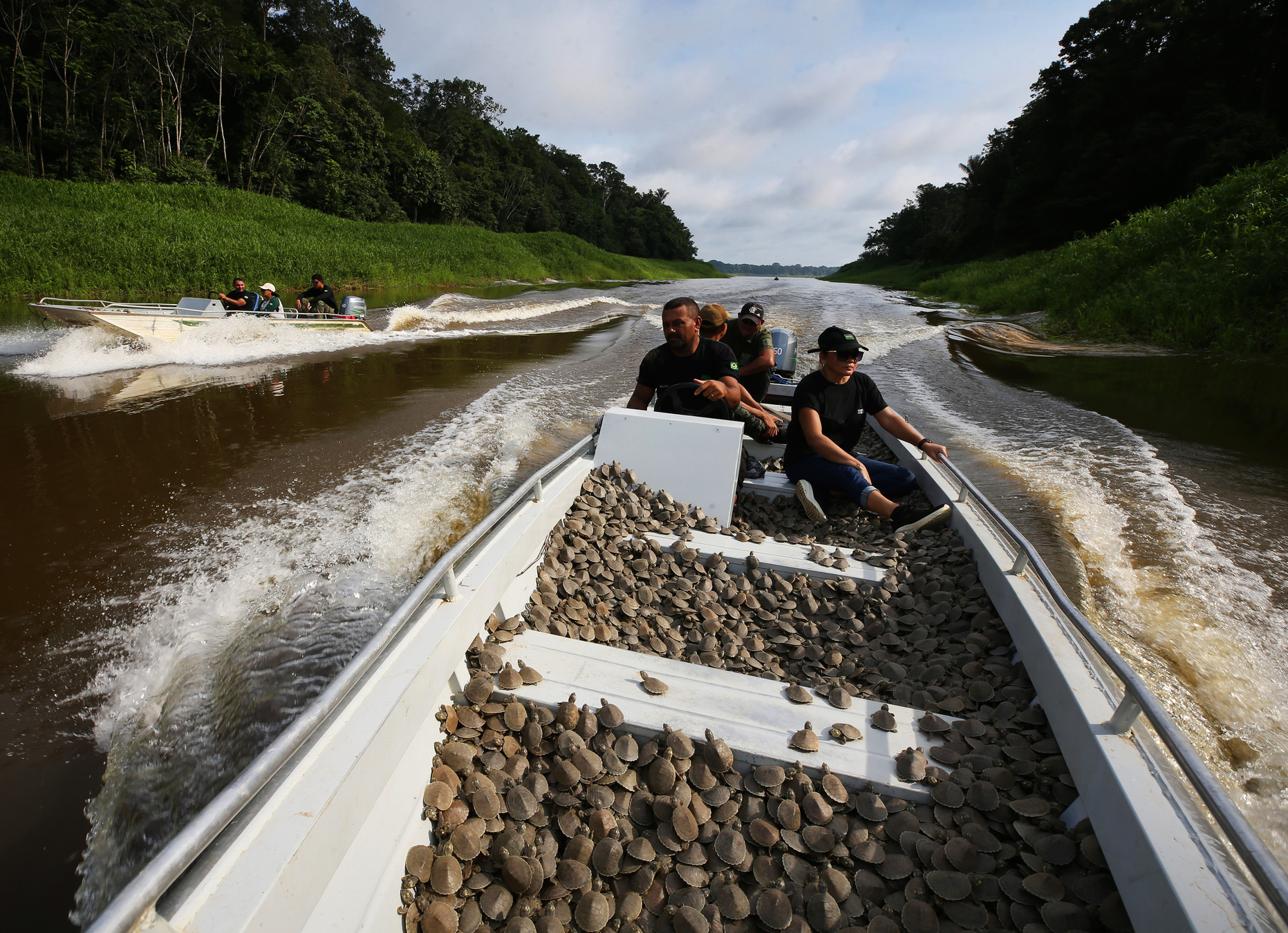 Agentes ambientais do ICMBio, transportam filhotes de tartaruga-da-amazônia, para serem soltas em local mais seguro, na Reserva Biológica do Abufari, em Tapauá, estado do Amazonas, Brasil, segunda-feira, 17 de novembro de 2025. Foto: Edmar Barros/Amazônia Latitude.