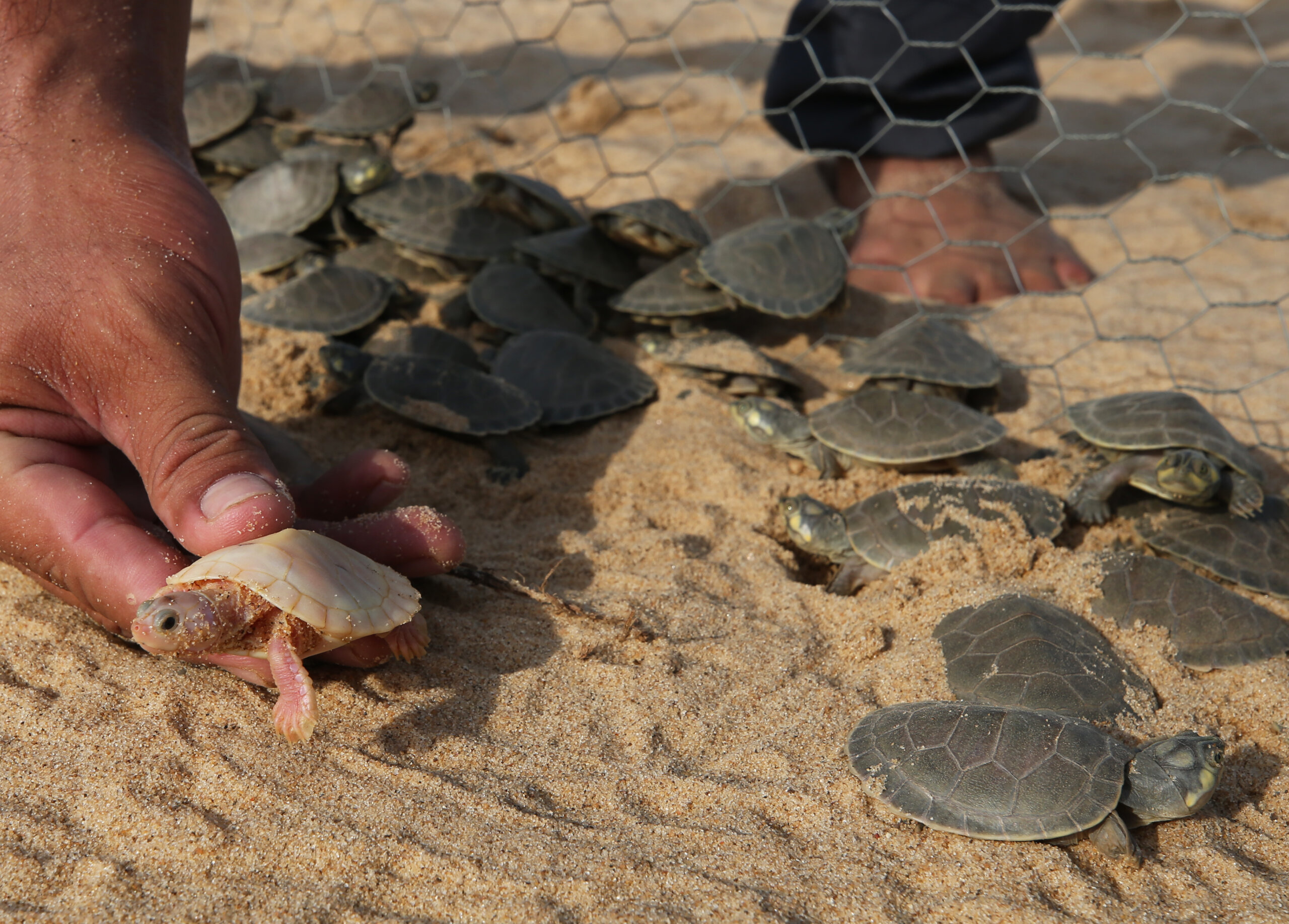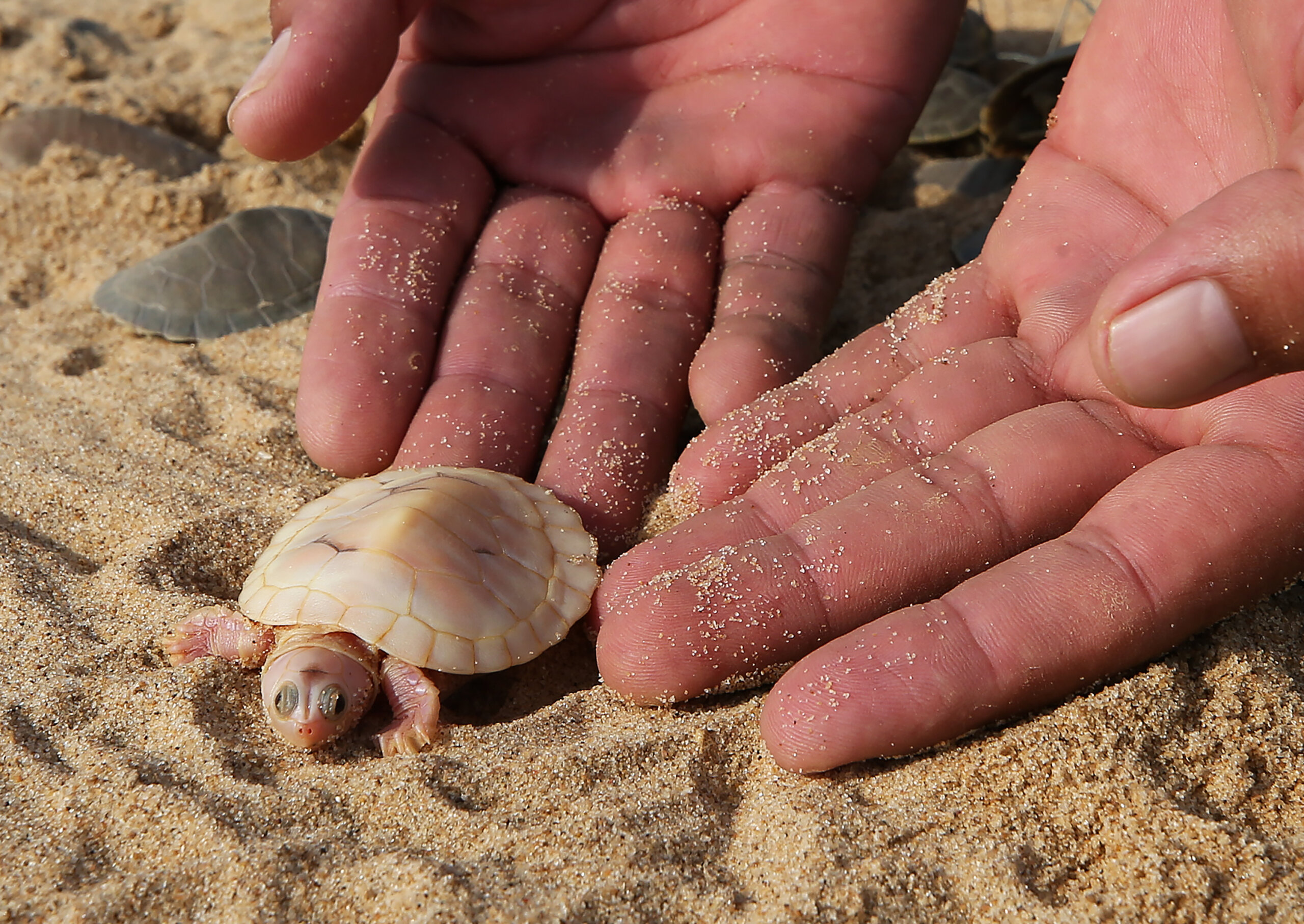 Entre as quase 170 mil eclosões, aconteceu algo ainda mais raro: nasceram três tartarugas albinas. Um evento que pode ocorrer apenas uma vez a cada centenas de milhares, ou até milhões, de nascimentos. Duas nasceram na mesma cova, em outro ponto da praia. Uma delas foi registrada por Edmar naquela madrugada exata do pico.