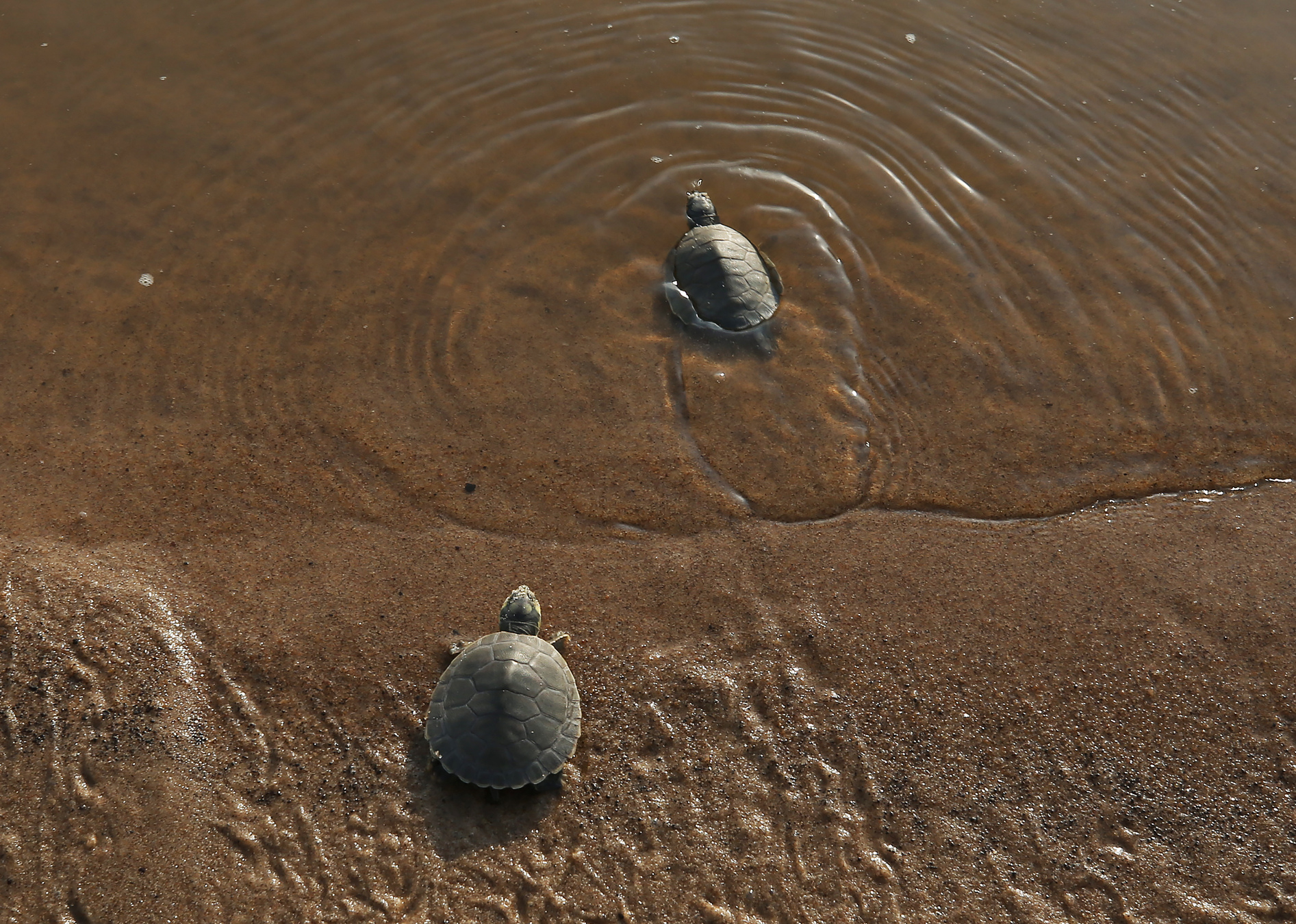 Filhotes de tartaruga-da-amazônia, recém-nascidos, aguardam para serem soltos na água, na Reserva Biológica do Abufari, em Tapauá (AM), 17 de novembro de 2025. Fotos: Edmar Barros/Amazônia Latitude.